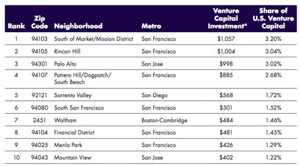Zip Code(郵便番号)別のVC投資額だと、上位10中4つがSFのSOMA周辺。また下記のレポートだと、高い家賃、賃金、多様性、人口密度とVC投資は相関。