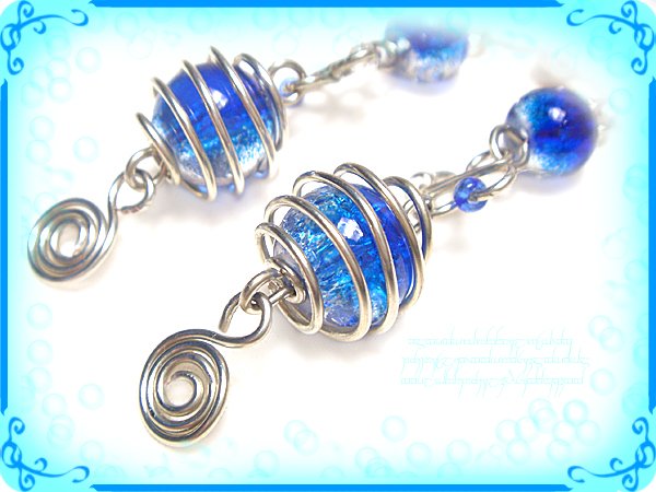大昔、東方の島国、ジパングに確かに存在したと伝わる“ちょんまげ”という独自の髪型をした刀剣の使い手、侍をイメージしたピアス●必殺!和風大江戸ぐるぐる流浪な浪人ピアス 七宝ビーズ青ハンドメイド手作りワイヤーワーク針金細工ワイヤーアート http://j.mp/b5fXZU